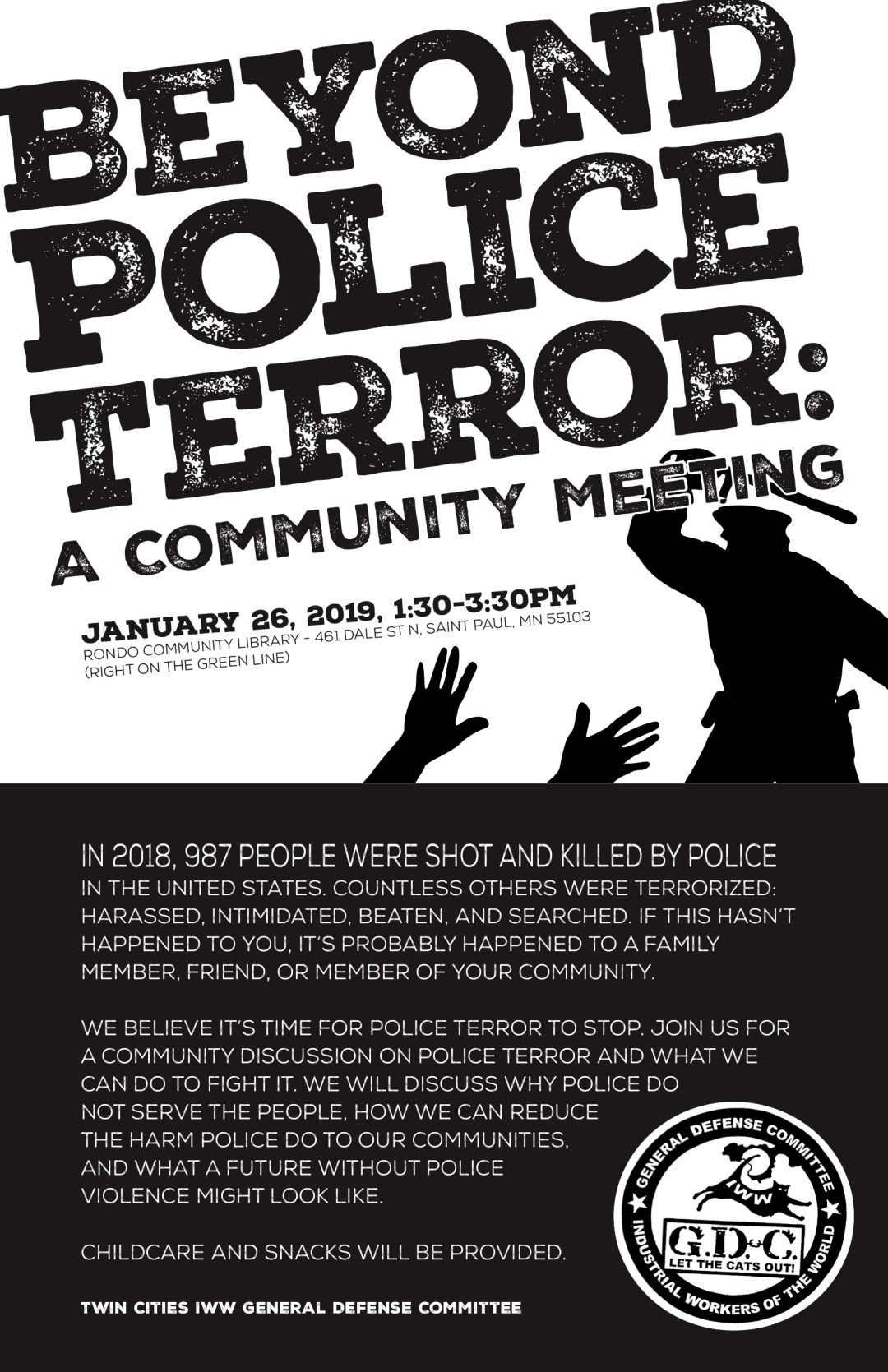 The Twin Cities General Defense Committee held a public educational event on the topics of police terror and police abolition this last Saturday at the Rondo Community Library in St. Paul. We're grateful to those who turned out, and for the conversations we had and were able to start. Look for us in the next … Continue reading Beyond Police Terror event